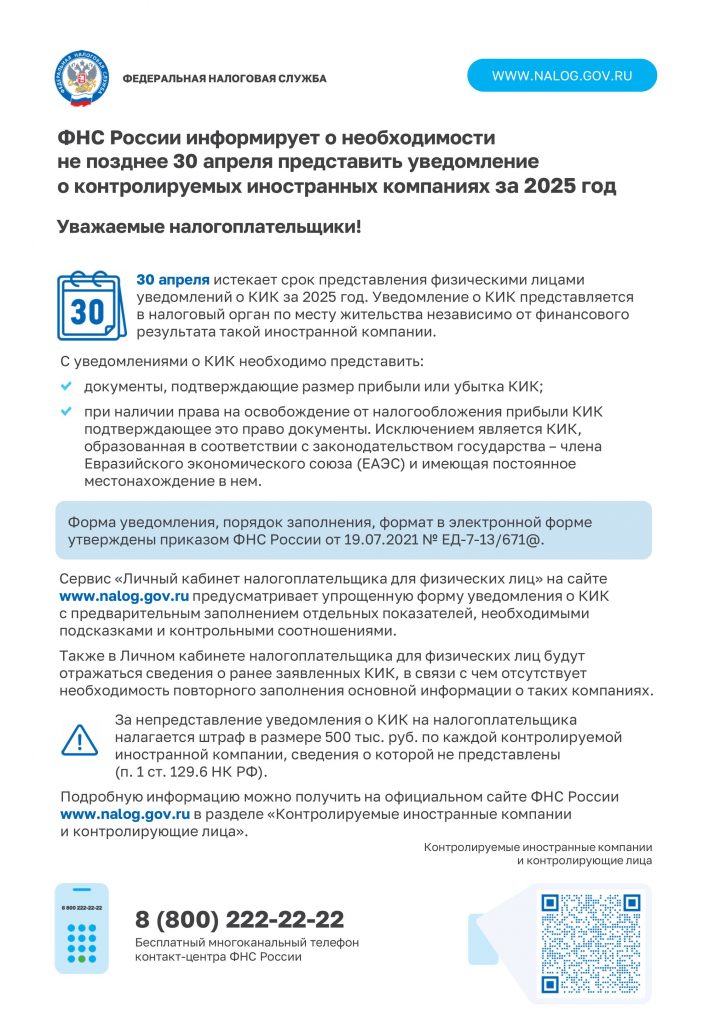 ФНС России информирует о необходимости не позднее 30 апреля представить уведомление о контролируемых иностранных компаниях за 2025 год 02.02.2026 от Администратор /